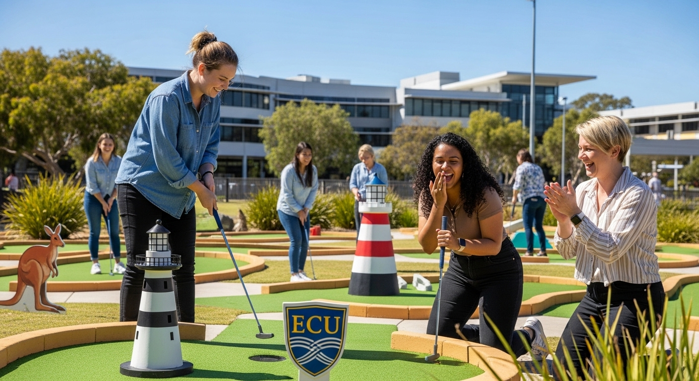 This photo captures a group of happy, smiling people enjoying a game of mini golf at a fun event at ECU in Joondalup, Australia. The custom mini-golf course provides a cheerful and engaging activity for students and community members.
