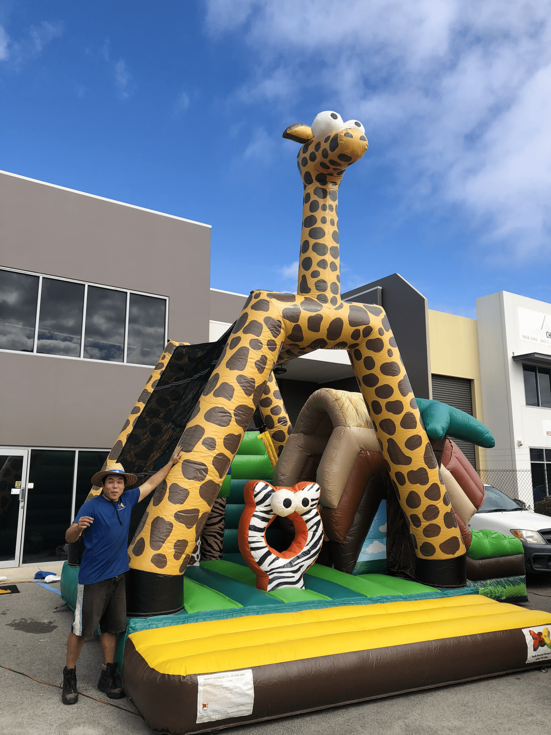 The giant Mr. Giraffe castle is perfect for both indoor and outdoor party locations that meet the set up requirements, with a guarantee of hours on end of exciting bouncy fun. It also has an open-faced design that allows for maximum aeration.