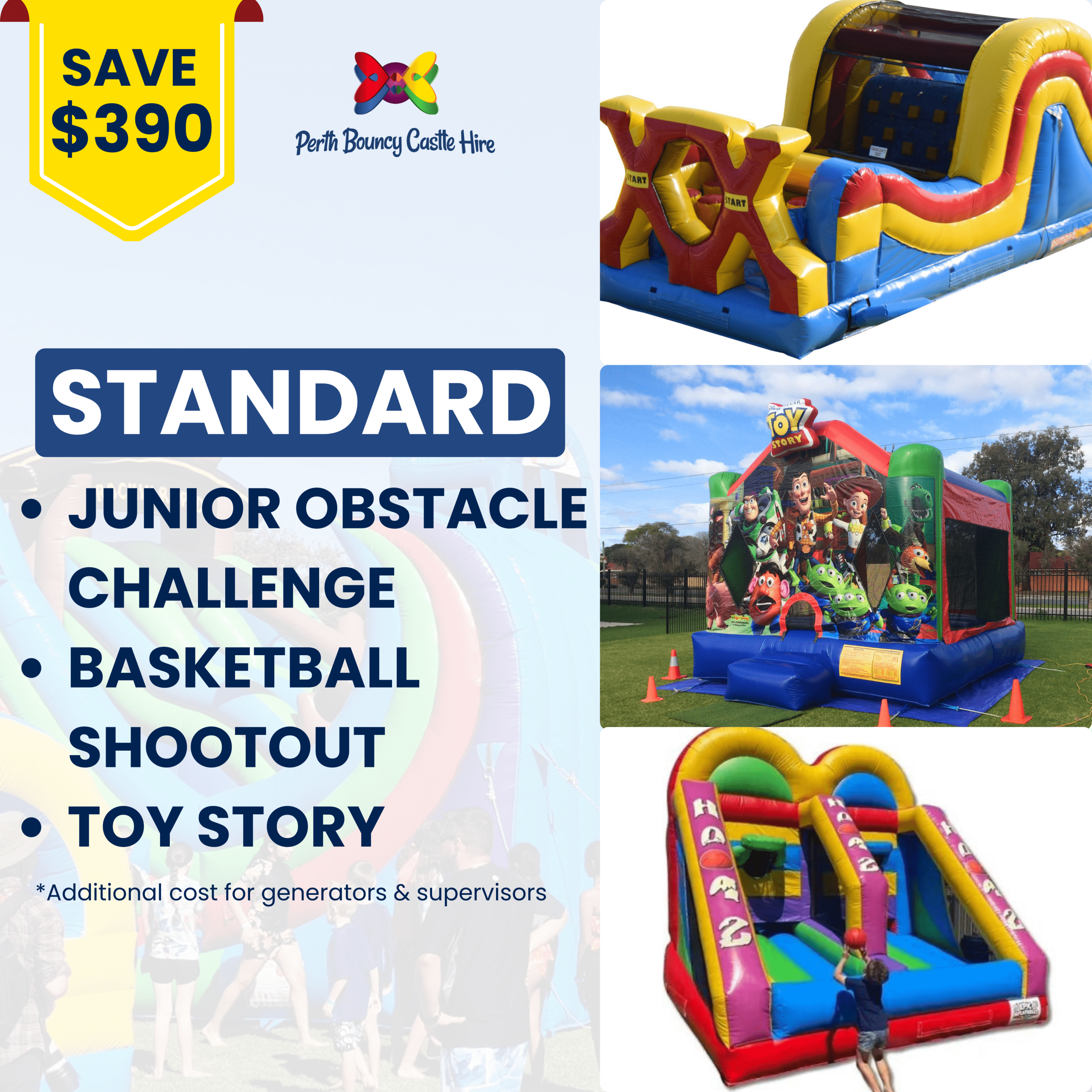 POWER : 3 x 10amp (power outlet within 20m from set up location) or generators available at additional cost