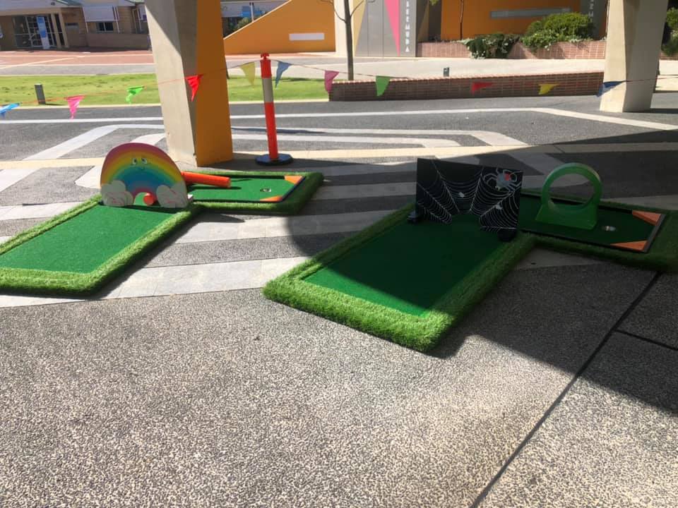 A high-quality image of the mini golf action at a lively event at ECU Joondalup. The photo highlights the fun and interactive nature of the game, perfect for engaging a crowd and creating a memorable experience.